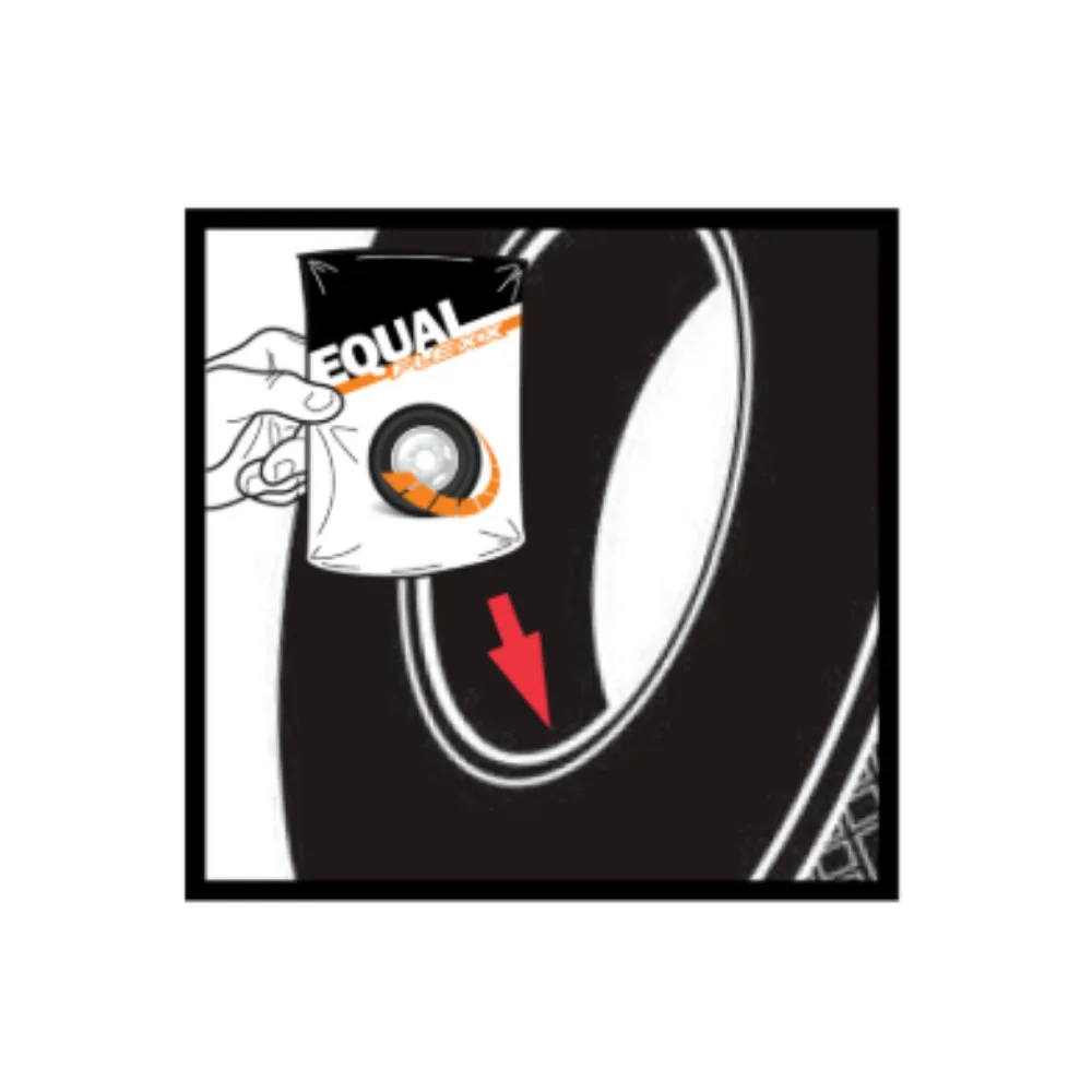EQUAL FLEXX består av en balanseringsmassa som placeras direkt i däcket vid montering. När hjulet börjar rulla fördelas materialet automatiskt och kompenserar för obalans i hela hjul- och däckpaketet.